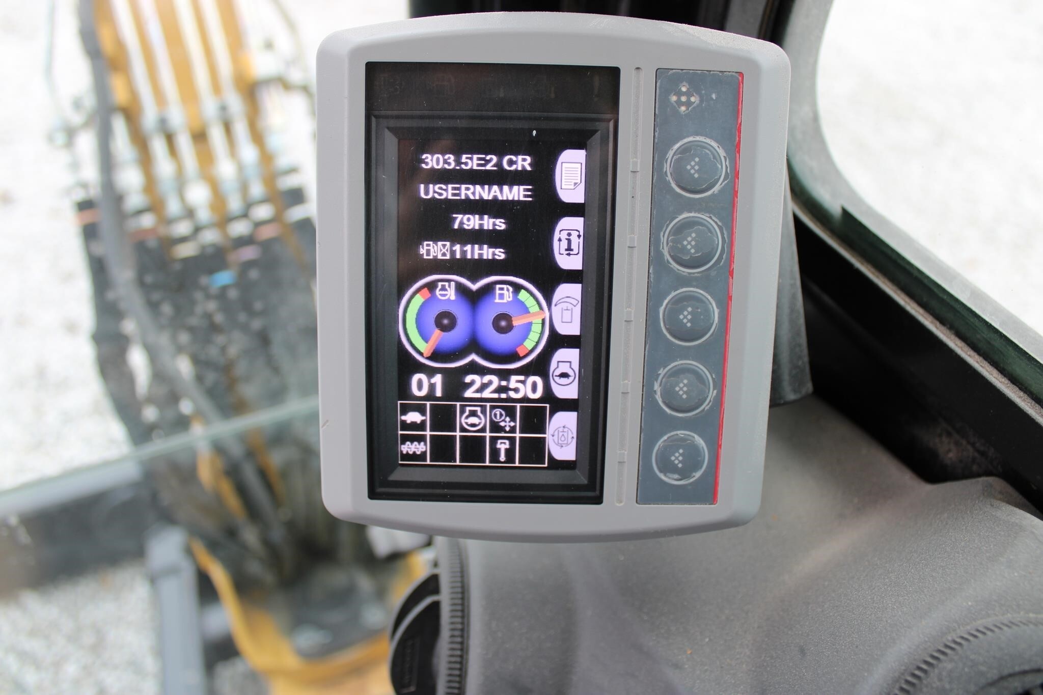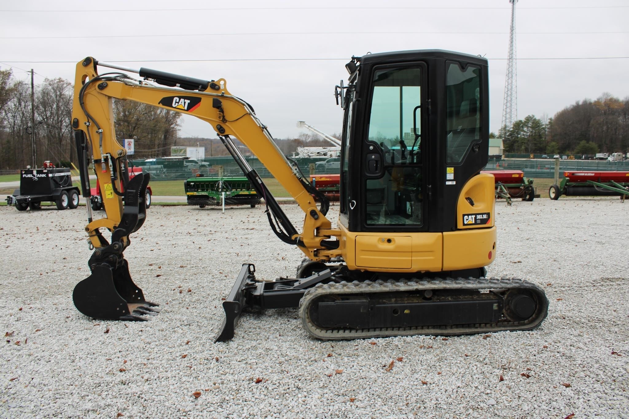 Cat 303.5E2 Excavator -23in Front Bucket with Thumb, 70in Angle Front Blade, 12in Rubber Tracks, Operating Weight: 9,239 lbs Detailed Specifications |